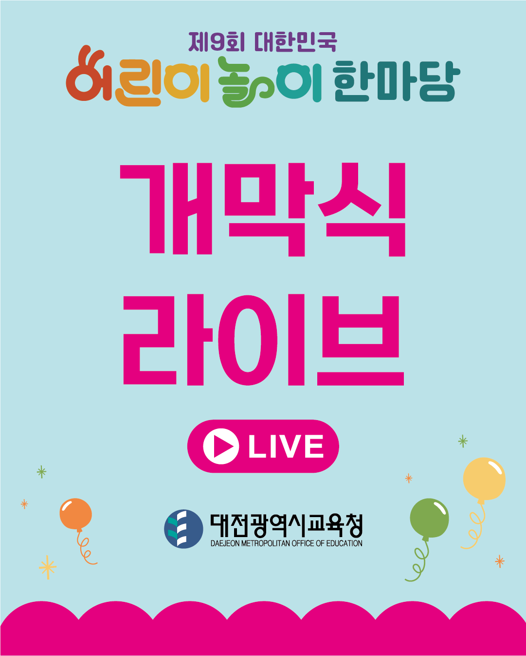 어린이놀이한마당 소식 개막식 라이브 안내 by 제9회 대한민국 어린이 놀이 한마당 2025. 5. 1. →5월 2일(금) 10시에 개막식이 열립니다.→ 개막식 라이브 시청 링크 개막식 [5.2.(금)/ 무대] 공유하기 게시글 관리 제9회 대한민국 어린이 놀이 한마당 '어린이놀이한마당 소식' 카테고리의 다른 글 프로그램 한 눈에 보기 (0) 2025.04.23 제9회 대한민국 어린이 놀이 한마당 소개 (0) 2025.04.10 관련글 프로그램 한 눈에 보기 제9회 대한민국 어린이 놀이 한마당 소개